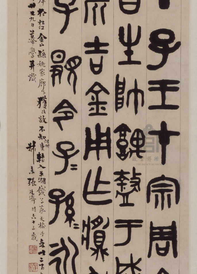 此作书写于道光十年(1830年),张廷济时年63岁。所书铭文与原铭文字形相比,外形虽颇接近,但由于书写材质与书写工具不同,笔画柔劲富于弹性,使转灵动自如,表现出笔墨轻重浓淡的变化。将古拙与生动融于一处,这是清代碑学书家所开创的书法审美境界,张廷济此作便是成功范例。